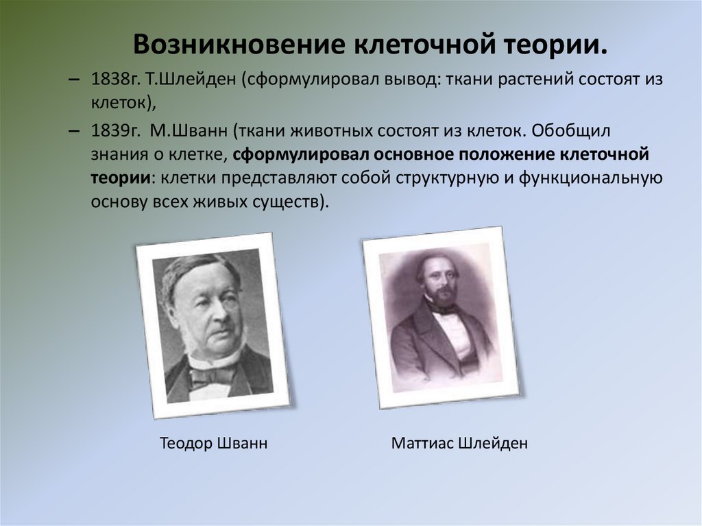 Возникновение клеточной теории.– 1838г. Т.Шлейден (сформулировал вывод: ткани растений состоят из