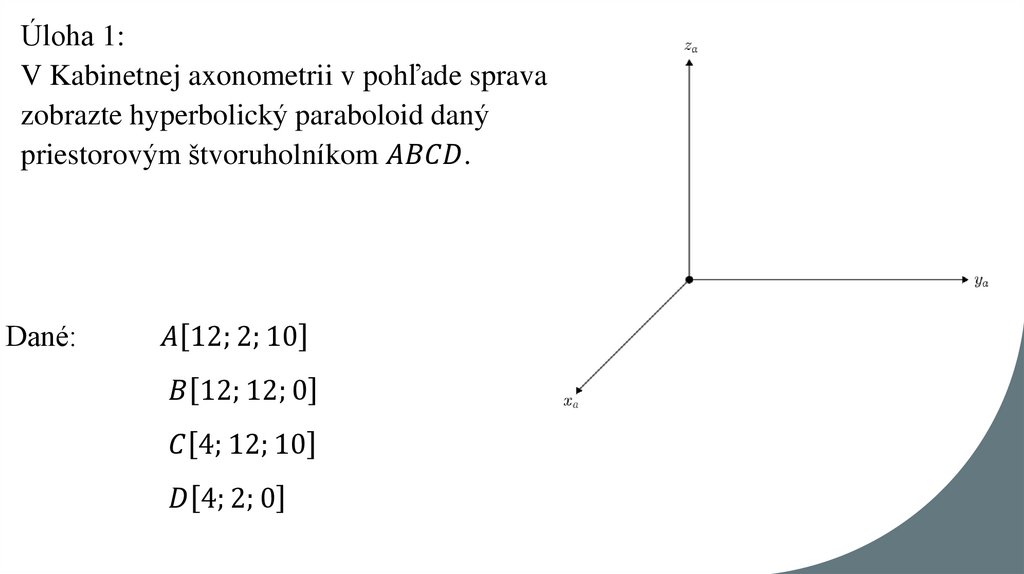 Úloha 1: V Kabinetnej axonometrii v pohľade sprava zobrazte hyperbolický paraboloid daný priestorovým štvoruholníkom ABCD.
