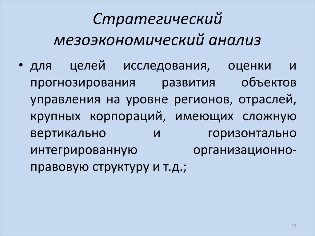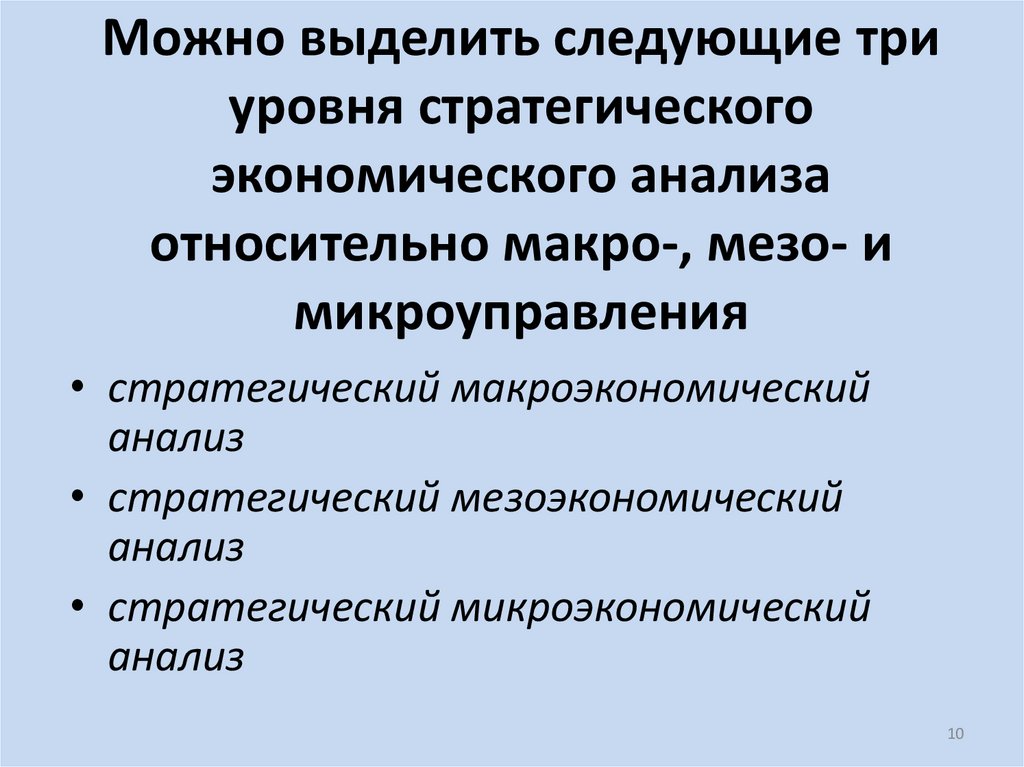 10. Можно выделить следующие три уровня стратегического экономического анализа относительно макро-, мезо- и микроуправления