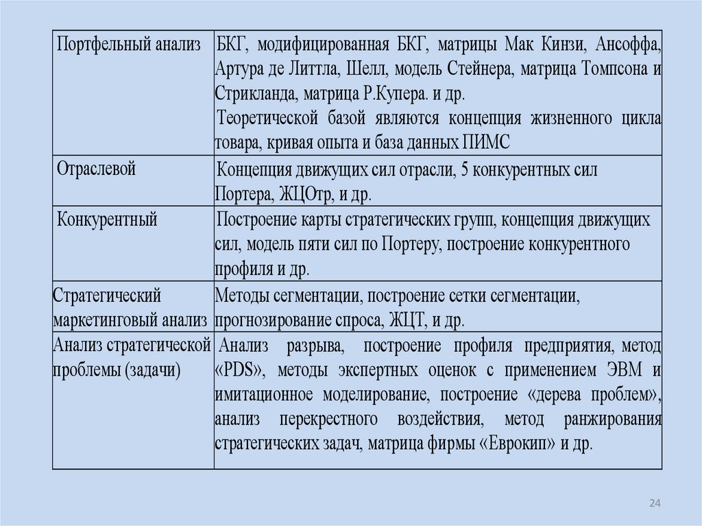 Портфельный анализ БКГ, модифицированная БКГ, матрицы Мак Кинзи, Ансоффа,Артура де Литтла, Шелл, модель Стейнера, матрица Томпсона и