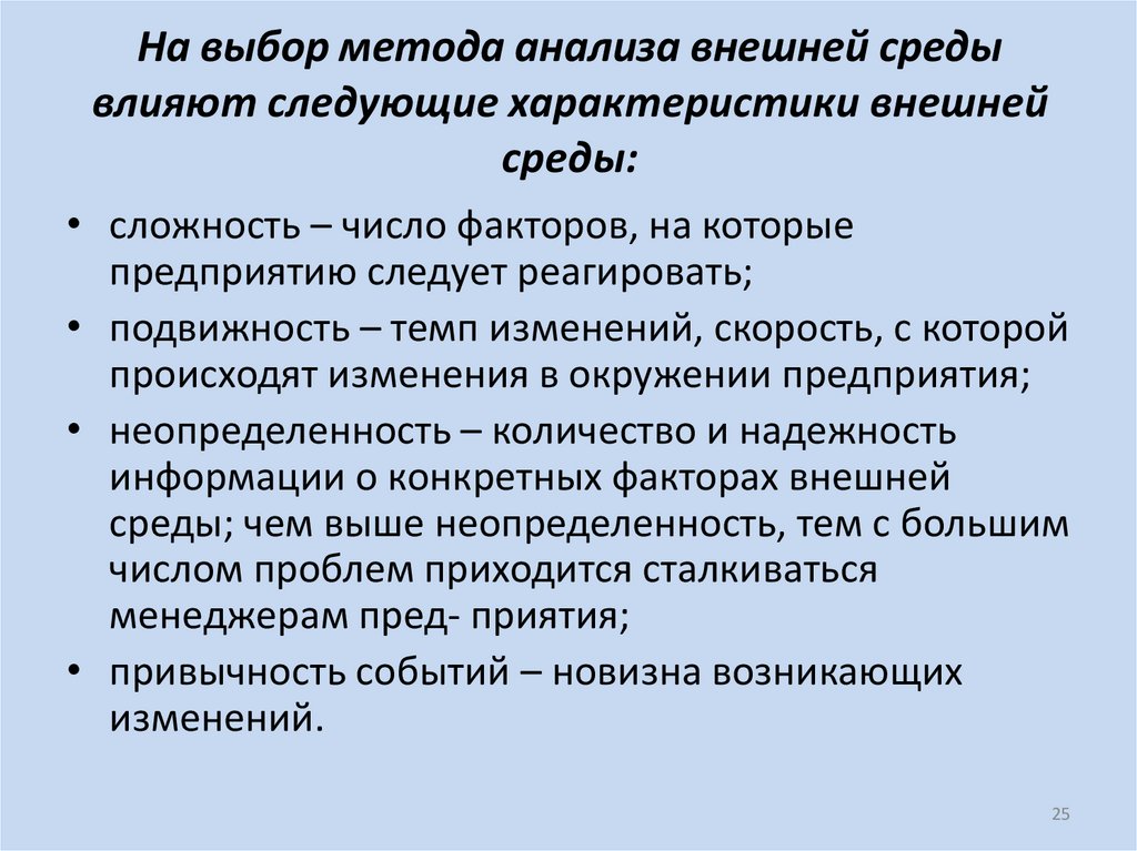 25. На выбор метода анализа внешней среды влияют следующие характеристики внешней среды: