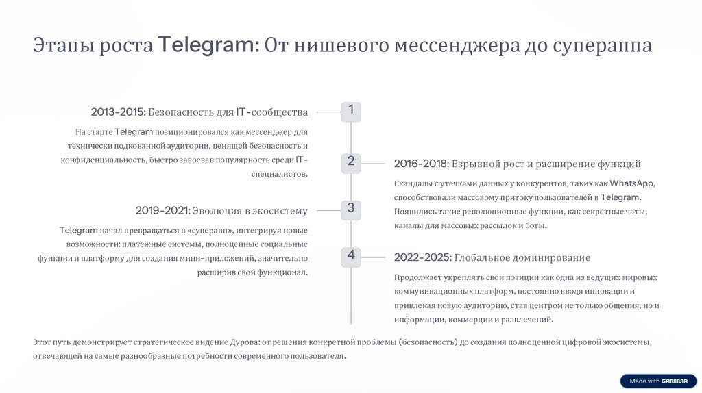 Этот путь демонстрирует стратегическое видение Дурова: от решения конкретной проблемы (безопасность) до создания полноценной цифровой экосистемы,