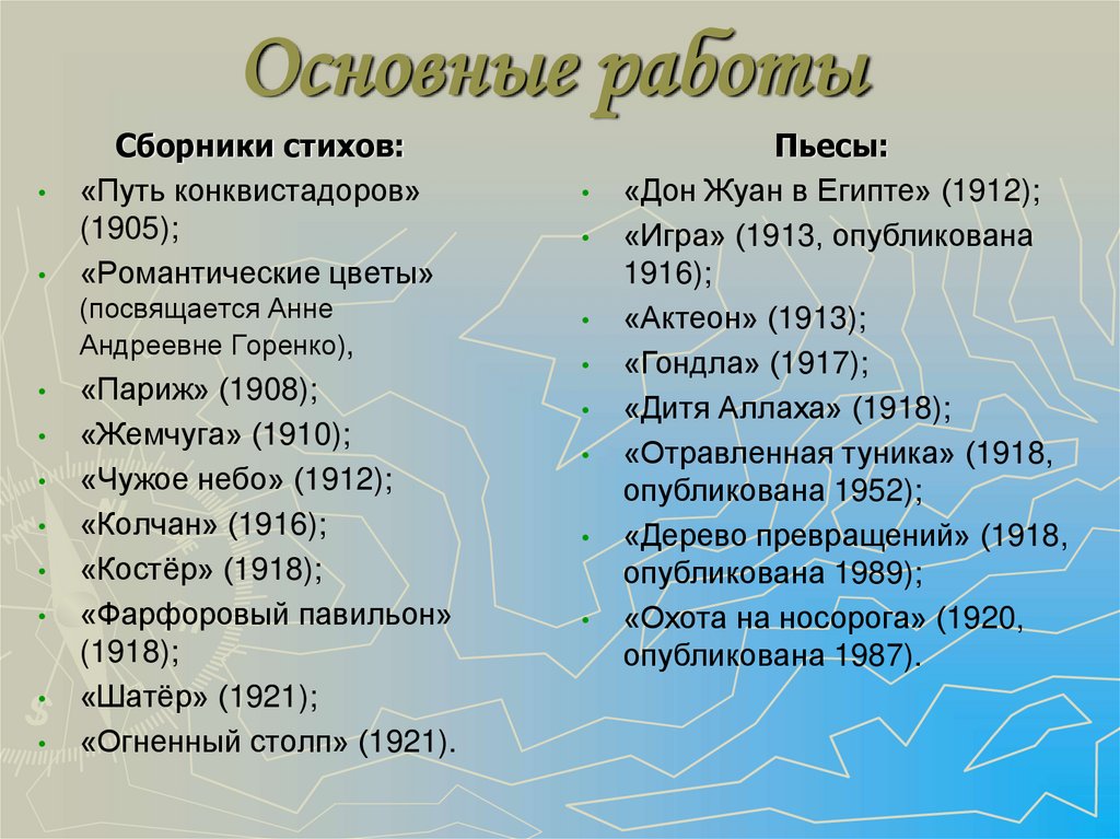 1. Анненков Ю. Николай Гумилёв / Анненков Ю. Дневник моих встреч. Циклтрагедий. — М.: Сов. композитор, 1992.