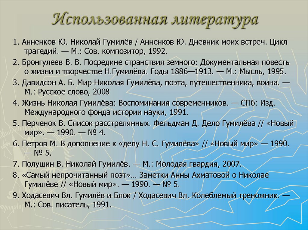 3. Давидсон А. Б. Мир Николая Гумилёва, поэта, путешественника, воина. —