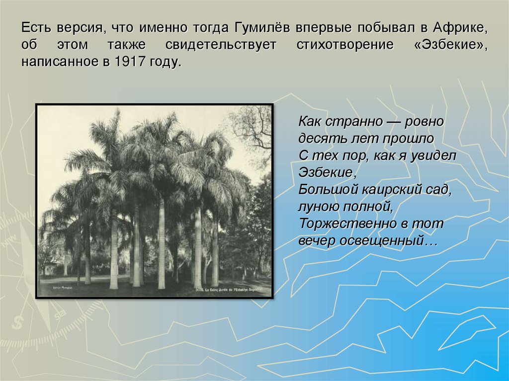 5. Есть версия, что именно тогда Гумилёв впервые побывал в Африке, об этом также свидетельствует стихотворение «Эзбекие»,