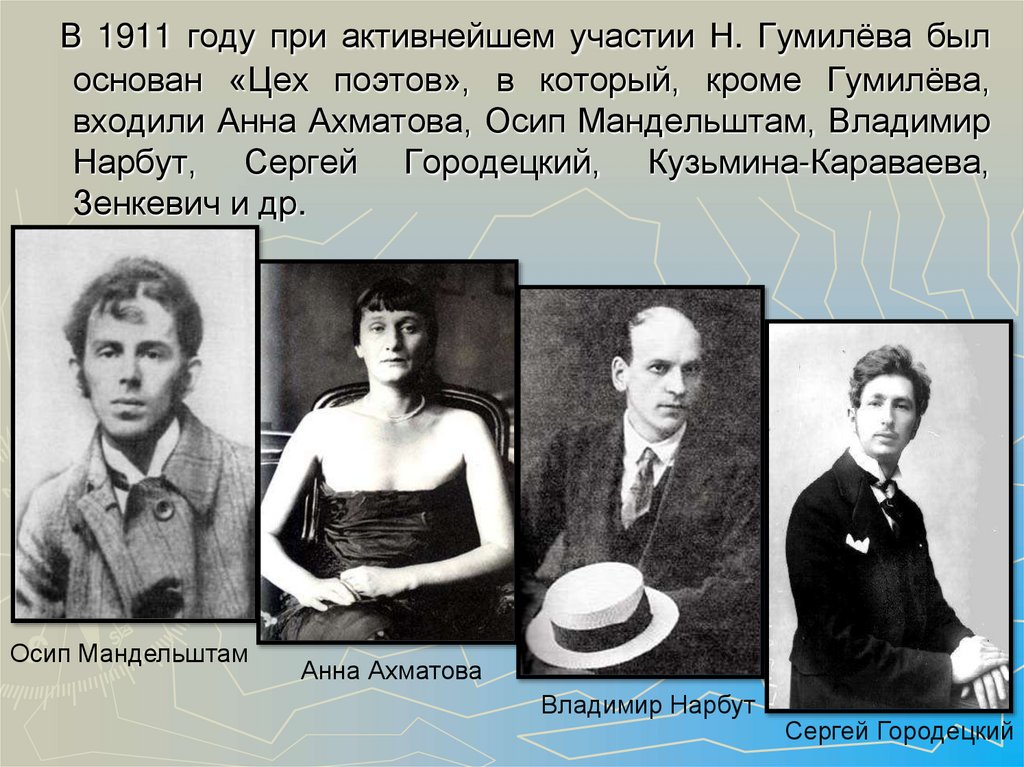 Николай Степанович Гумилёвявляется одним из главных