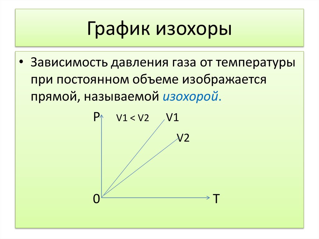 • Зависимость давления газа от температурыпри постоянном объеме изображается