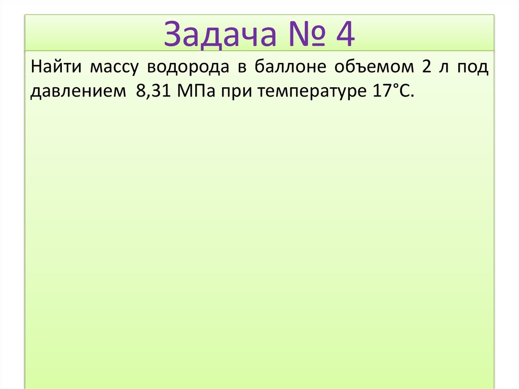 Найти массу водорода в баллоне объемом 2 л поддавлением 8,31 МПа при температуре 17°С.