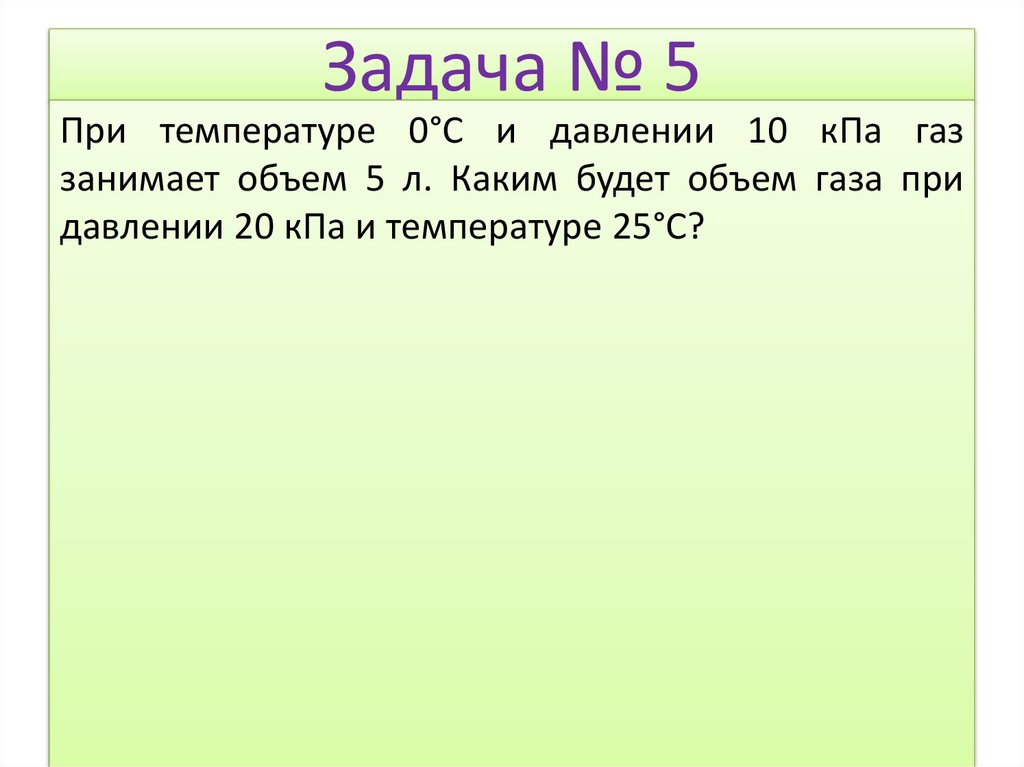 При температуре 0°С и давлении 10 кПа газзанимает объем 5 л. Каким будет объем газа при