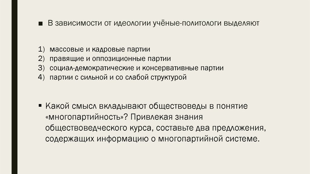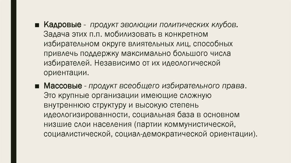 ■ В зависимости от идеологии учёные-политологи выделяют1) массовые и кадровые партии