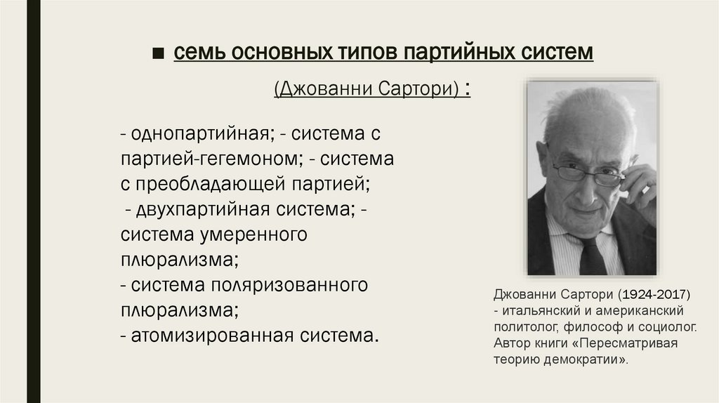 ■ семь основных типов партийных систем(Джованни Сартори) :