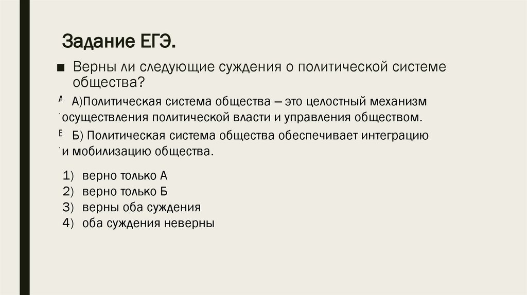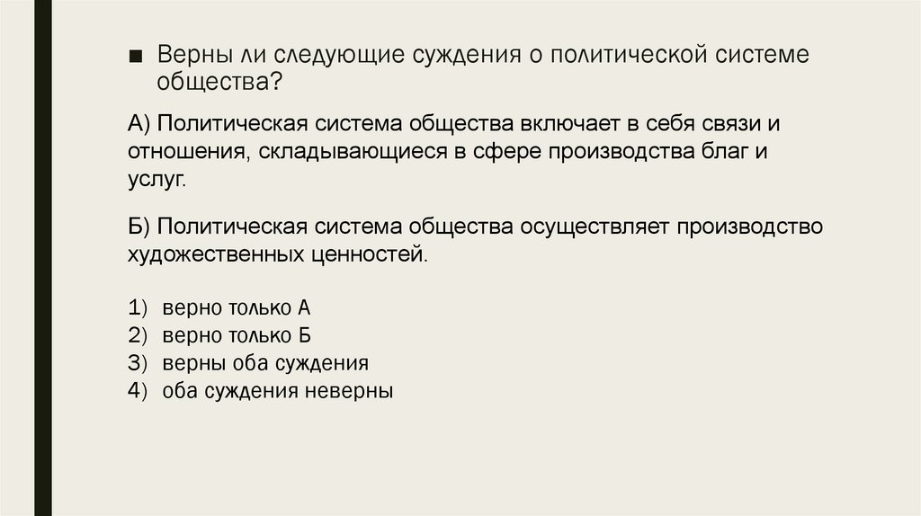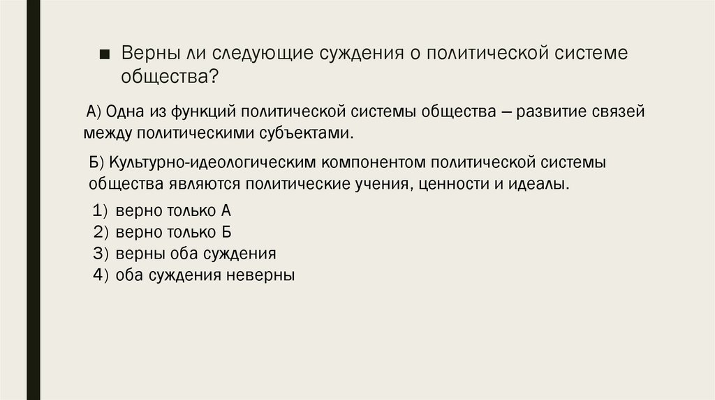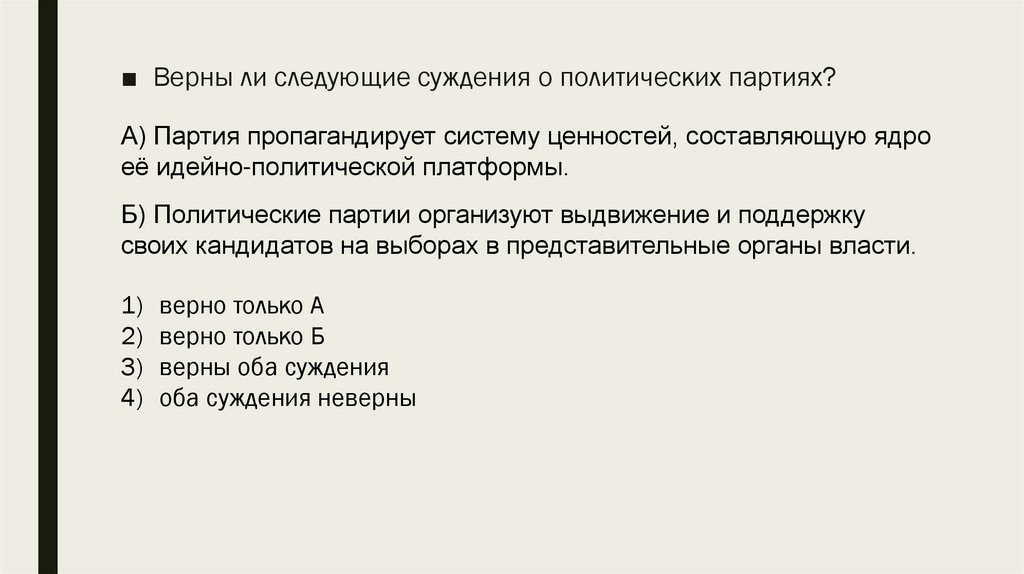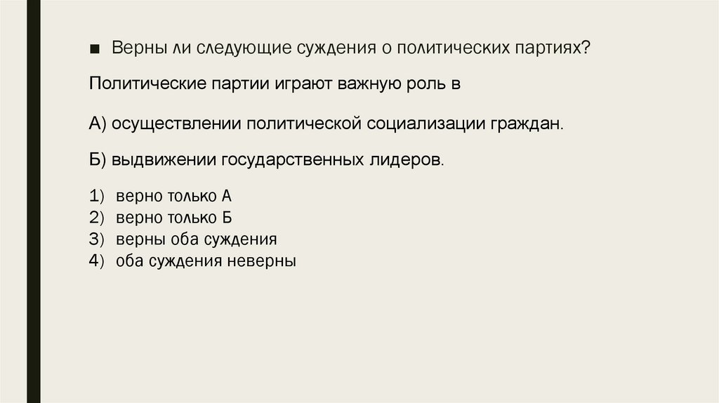 ■ Верны ли следующие суждения о политических партиях?Политические партии играют важную роль в