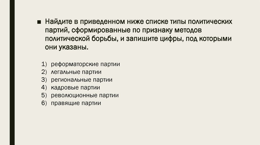 ■ Найдите в приведенном ниже списке типы политическихпартий, сформированные по признаку методов