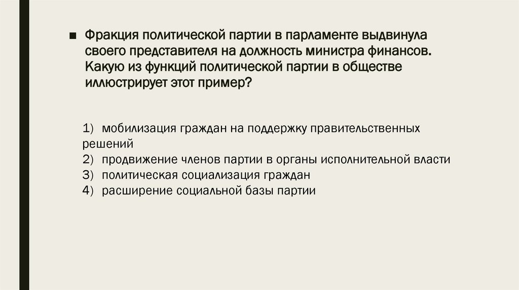 ■ Фракция политической партии в парламенте выдвинуласвоего представителя на должность министра финансов.