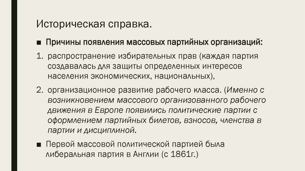 ■ Причины появления массовых партийных организаций:1. распространение избирательных прав (каждая партия