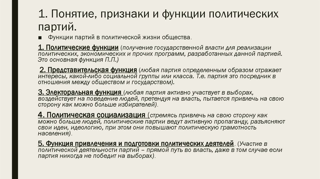 ■ Функции партий в политической жизни общества.1. Политические функции (получение государственной власти для реализации