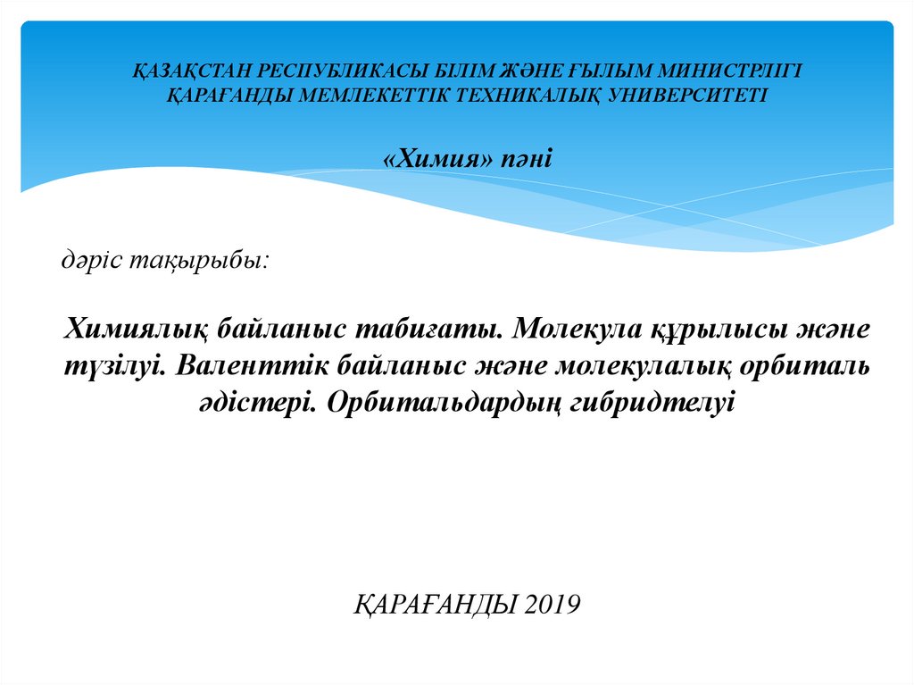 1. ҚАЗАҚСТАН РЕСПУБЛИКАСЫ БІЛІМ ЖӘНЕ ҒЫЛЫМ МИНИСТРЛІГІ ҚАРАҒАНДЫ МЕМЛЕКЕТТІК ТЕХНИКАЛЫҚ УНИВЕРСИТЕТІ «Химия» пәні дәріс тақырыбы: