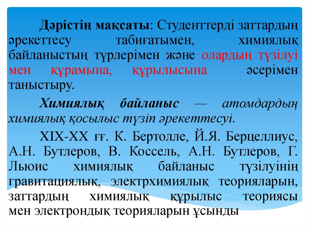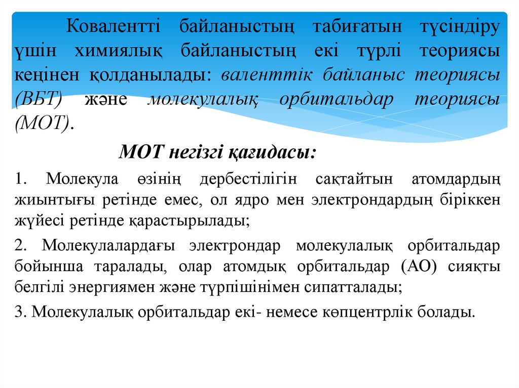 Химиялық байланыс табиғаты. Молекула құрылысы жәнетүзілуі. Валенттік байланыс және молекулалық орбиталь