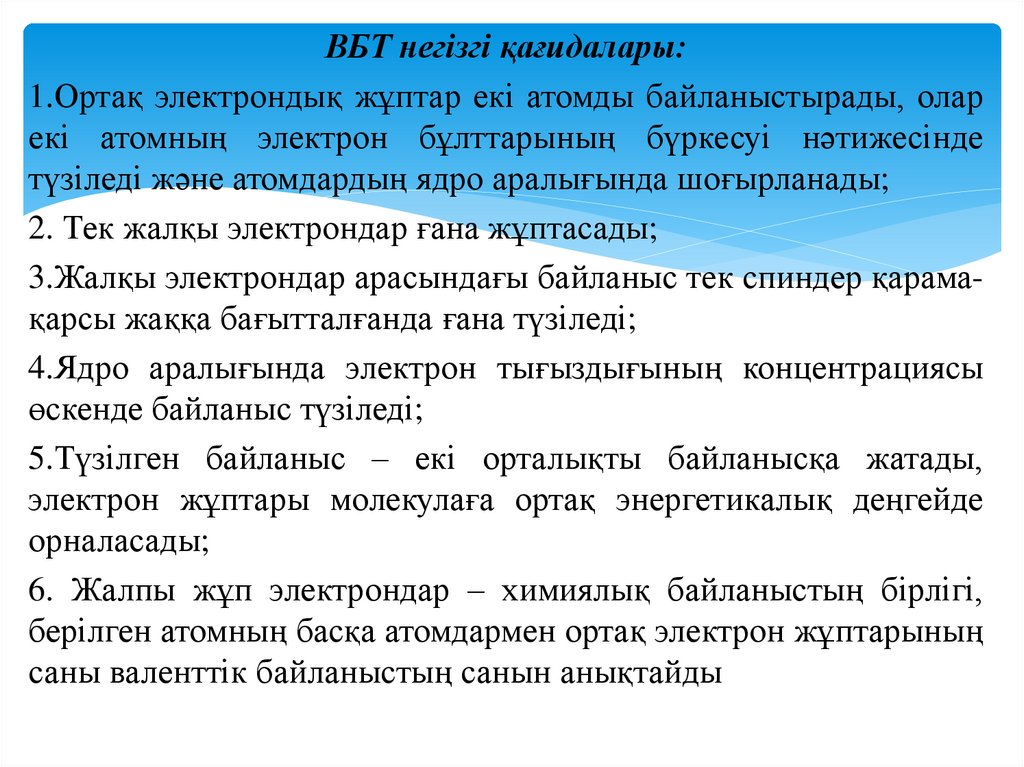 ВБТ негізгі қағидалары:1.Ортақ электрондық жұптар екі атомды байланыстырады, олар