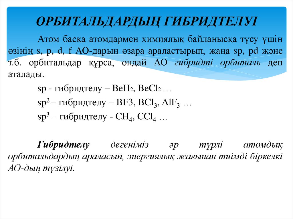 Атом басқа атомдармен химиялық байланысқа түсу үшінөзінің s, p, d, f АО-дарын өзара араластырып, жаңа sp, pd және