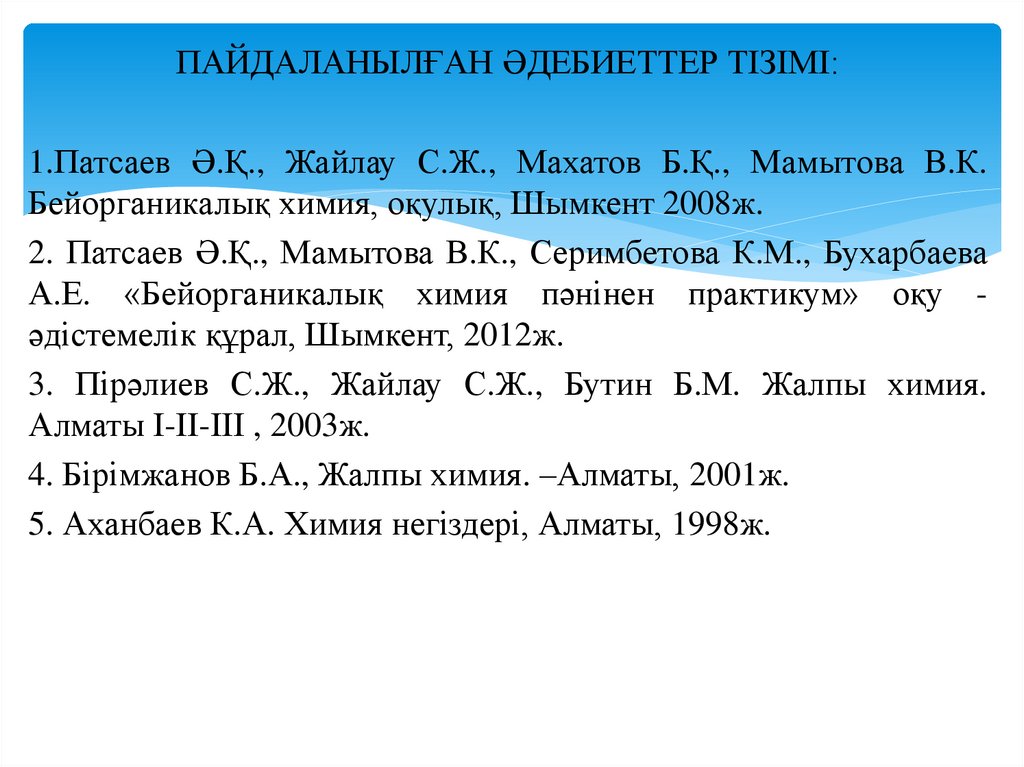 ПАЙДАЛАНЫЛҒАН ӘДЕБИЕТТЕР ТІЗІМІ:1.Патсаев Ә.Қ., Жайлау С.Ж., Махатов Б.Қ., Мамытова В.К.