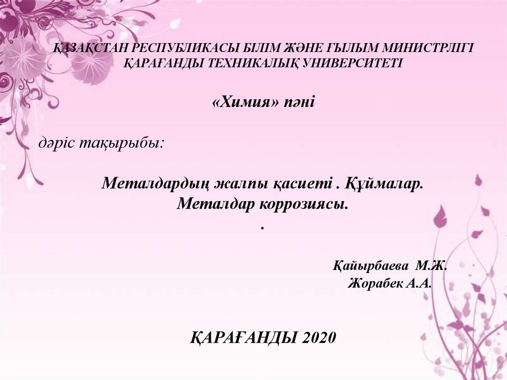 1. ҚАЗАҚСТАН РЕСПУБЛИКАСЫ БІЛІМ ЖӘНЕ ҒЫЛЫМ МИНИСТРЛІГІ ҚАРАҒАНДЫ ТЕХНИКАЛЫҚ УНИВЕРСИТЕТІ «Химия» пәні дәріс тақырыбы: Металдардың