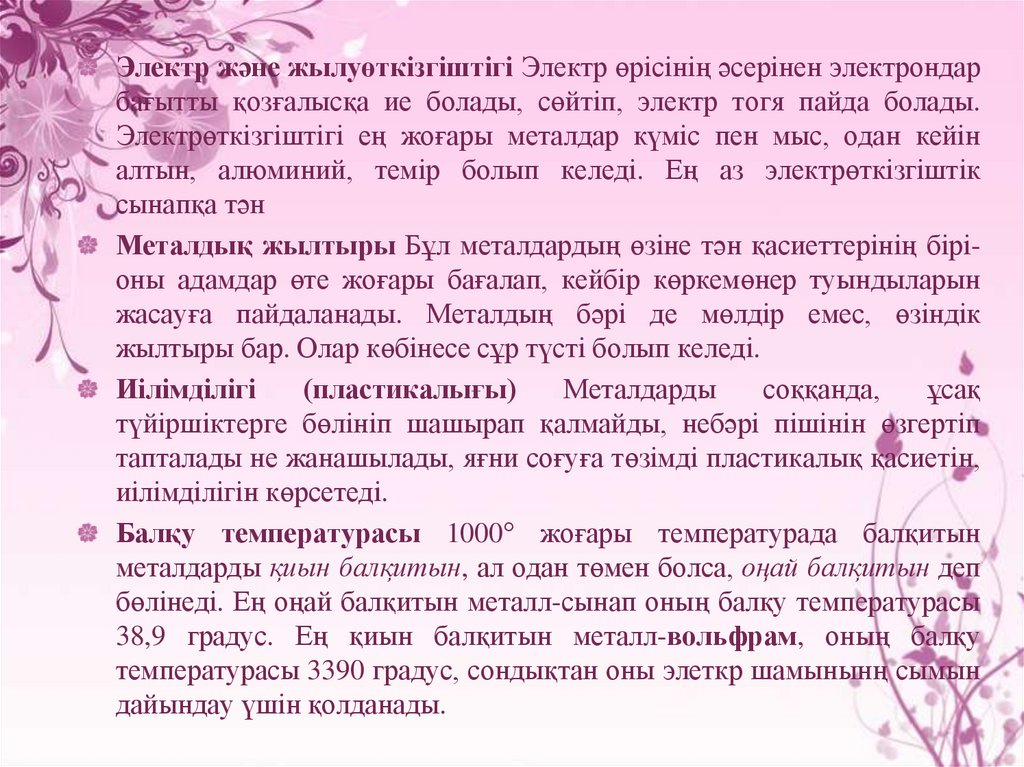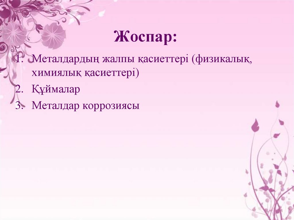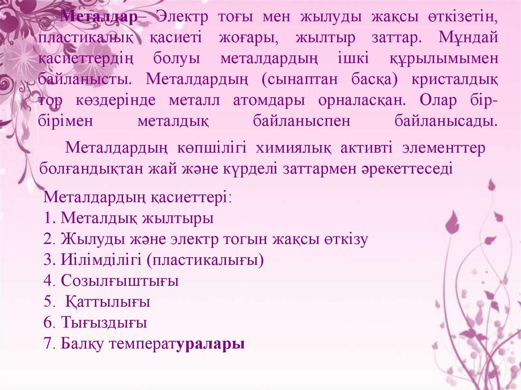 1. Металдардың жалпы қасиеттері (физикалық,химиялық қасиеттері)