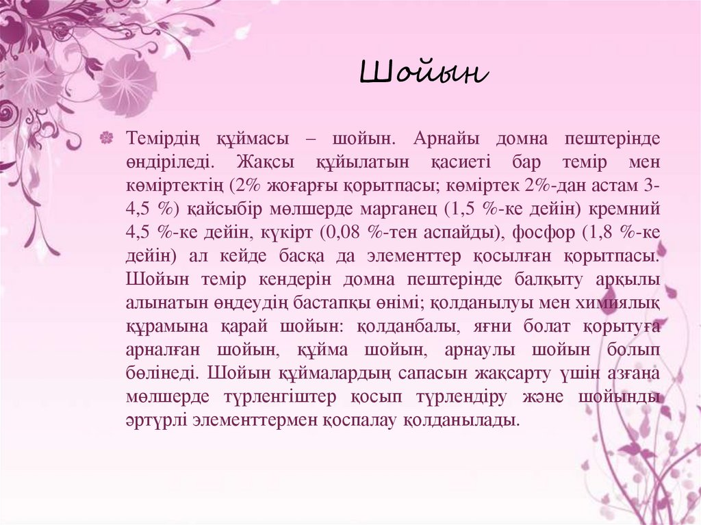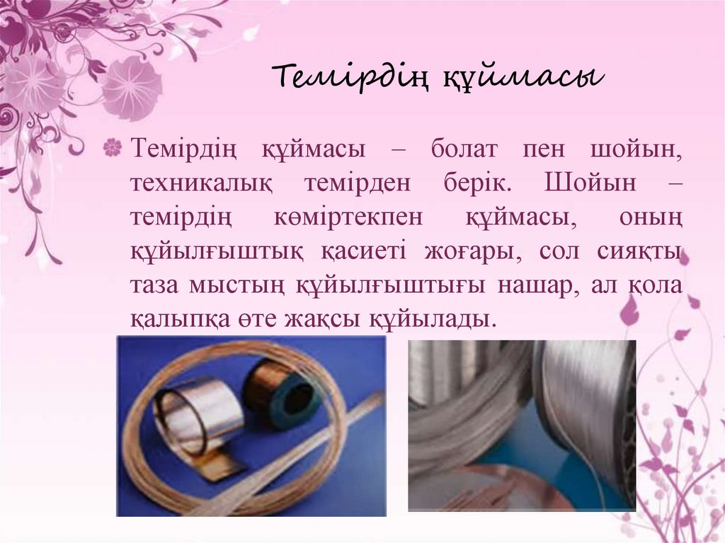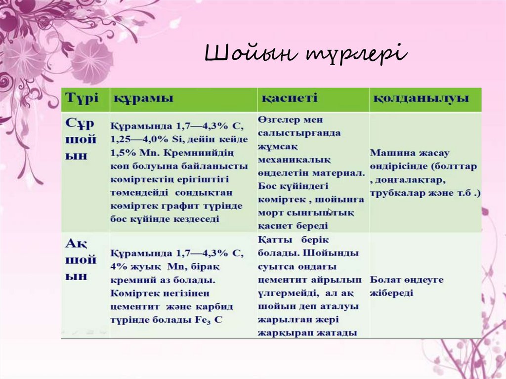 болатын қосылыстар. Құйманың компонеті қасиеттері