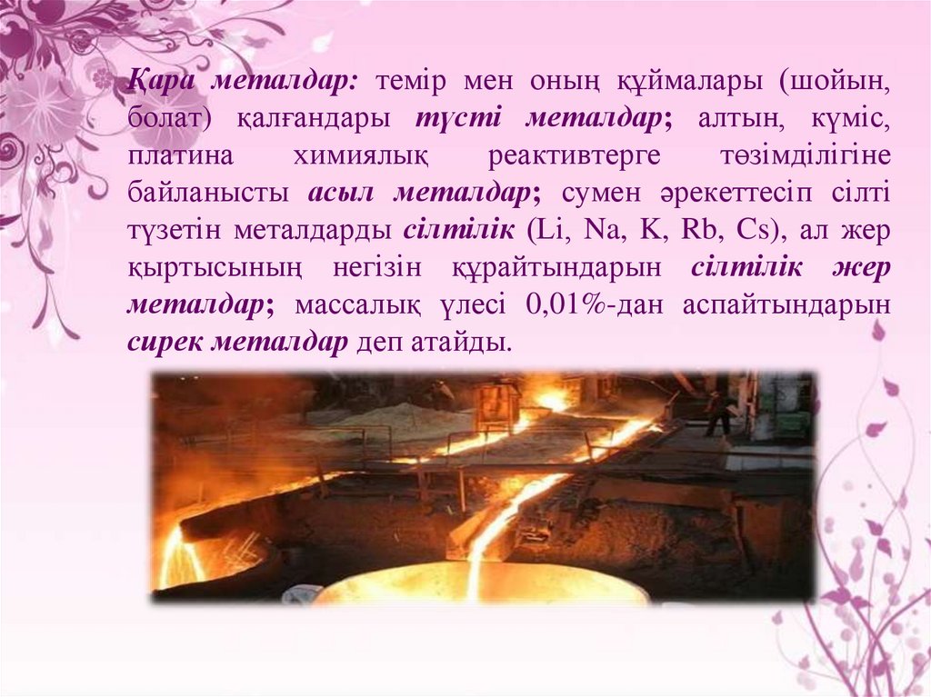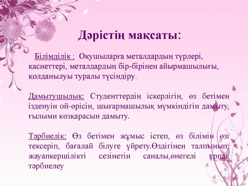 Дәрістің мақсаты:Білімділік : Оқушыларға металдардың түрлері,