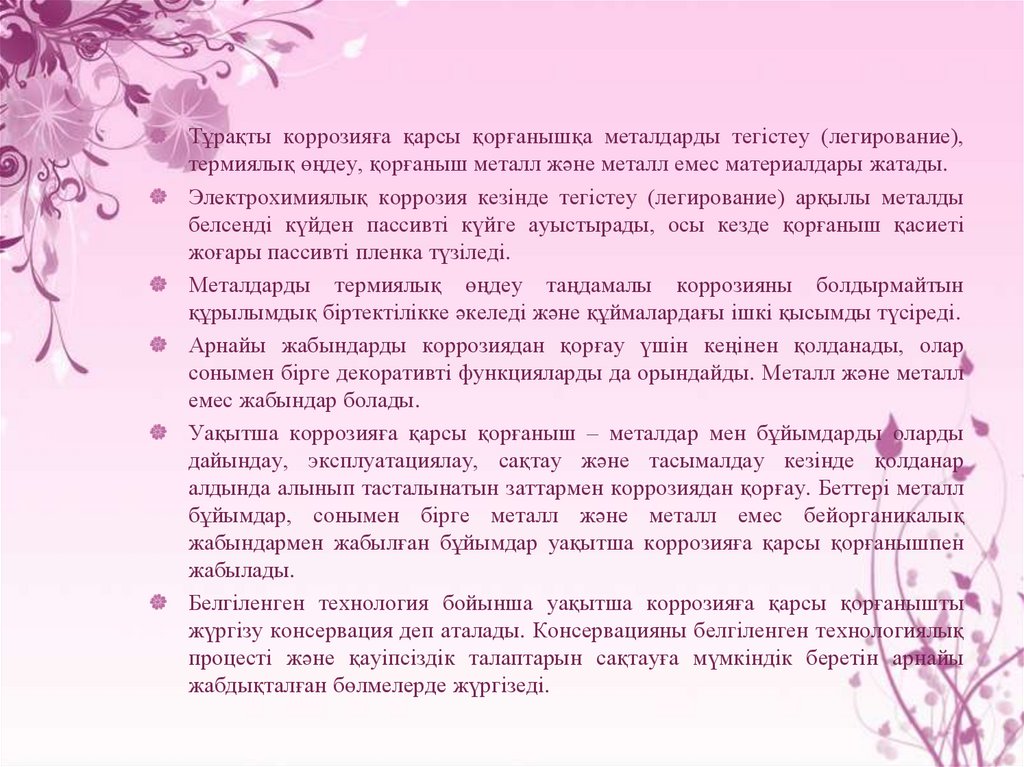 Тұрақты коррозияға қарсы қорғанышқа металдарды тегістеу (легирование),термиялық өңдеу, қорғаныш металл және металл емес материалдары жатады.