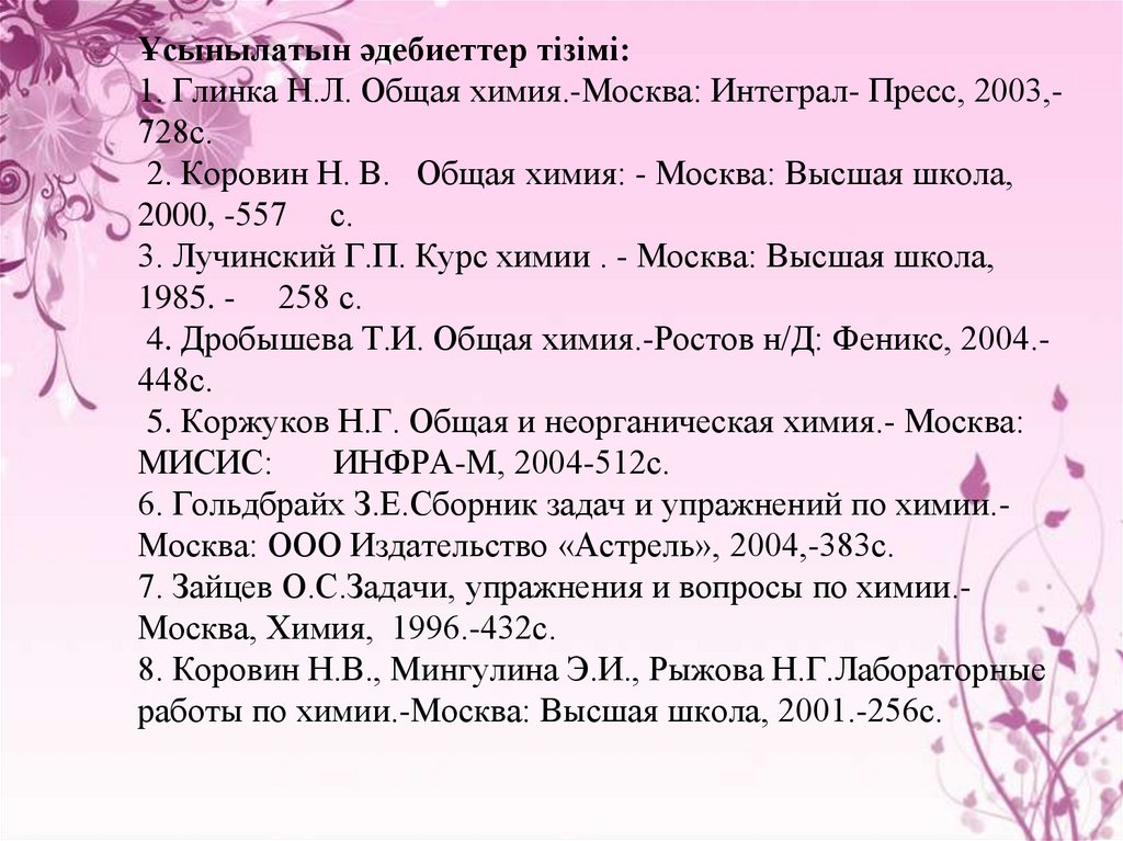 Ұсынылатын әдебиеттер тізімі:1. Глинка Н.Л. Общая химия.-Москва: Интеграл- Пресс, 2003,728с.