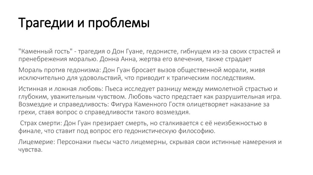 Трагедии и проблемы"Каменный гость" - трагедия о Дон Гуане, гедонисте, гибнущем из-за своих страстей и
