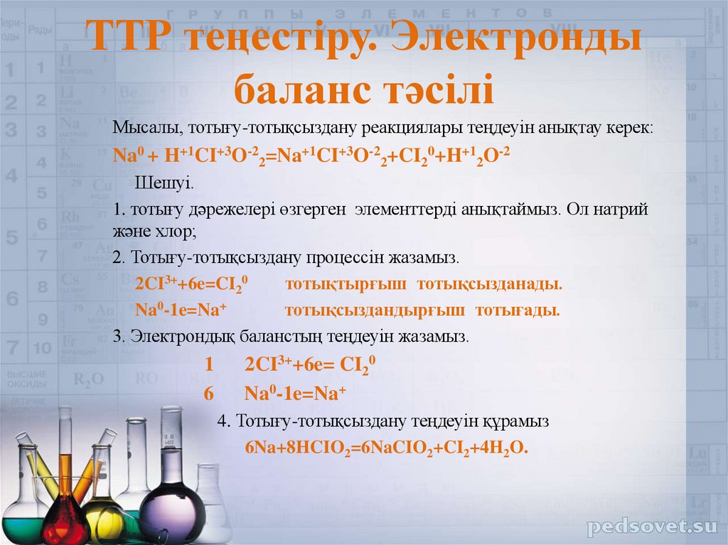 Мысалы, тотығу-тотықсыздану реакциялары теңдеуін анықтау керек:Na0 + H+1CI+3O-22=Na+1CI+3O-22+CI20+H+12O-2