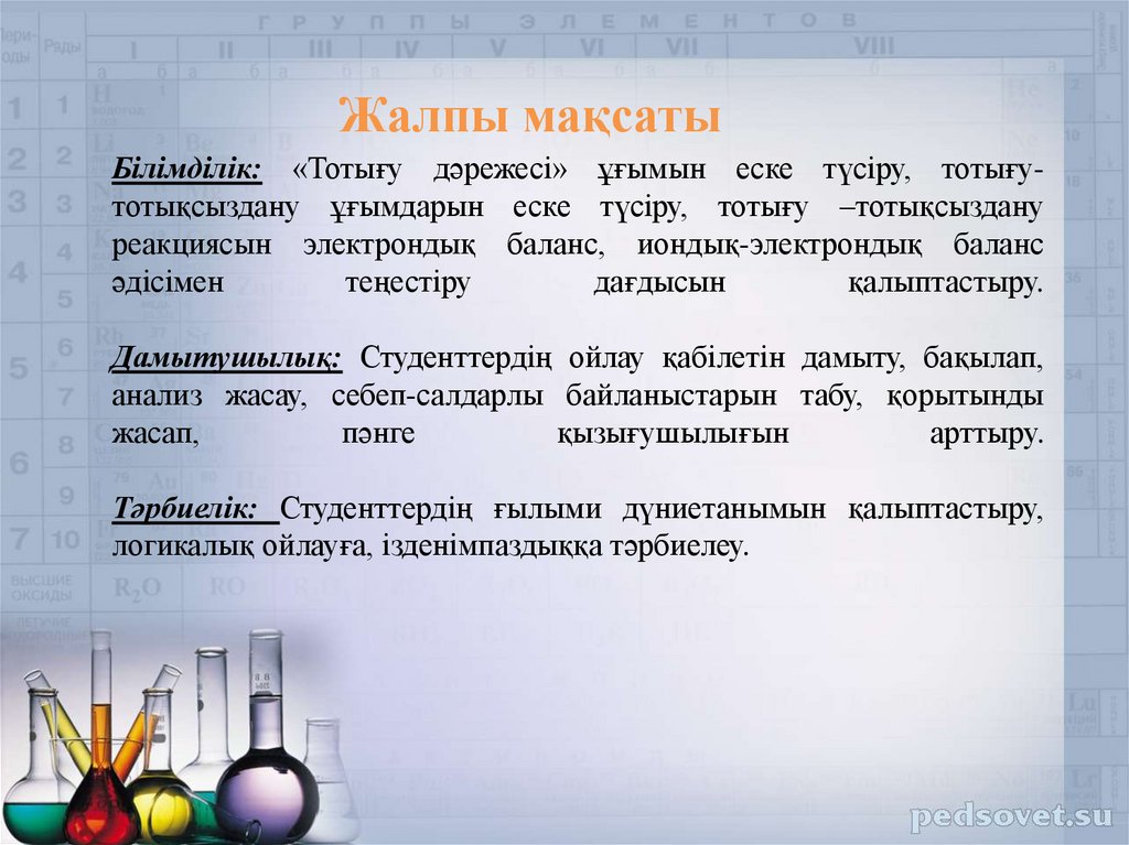 Жалпы мақсатыБілімділік: «Тотығу дәрежесі» ұғымын еске түсіру, тотығутотықсыздану ұғымдарын еске түсіру, тотығу –тотықсыздану