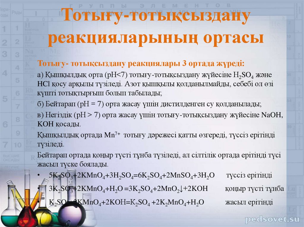 Тотығу- тотықсыздану реакциялары 3 ортада жүреді:а) Қышқылдық орта (рН<7) тотығу-тотықсыздану жүйесіне Н2SO4 және