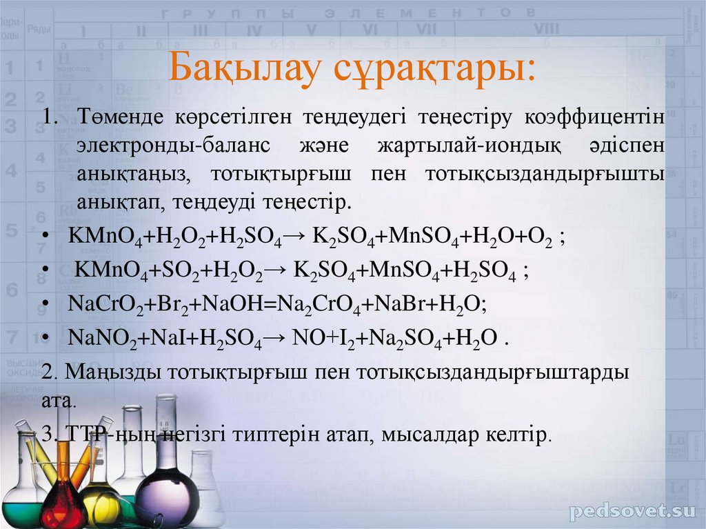 1. Төменде көрсетілген теңдеудегі теңестіру коэффицентінэлектронды-баланс және жартылай-иондық әдіспен