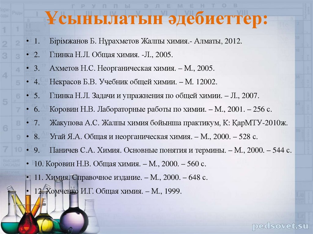 • 1.Бірімжанов Б. Нұрахметов Жалпы химия.- Алматы, 2012.