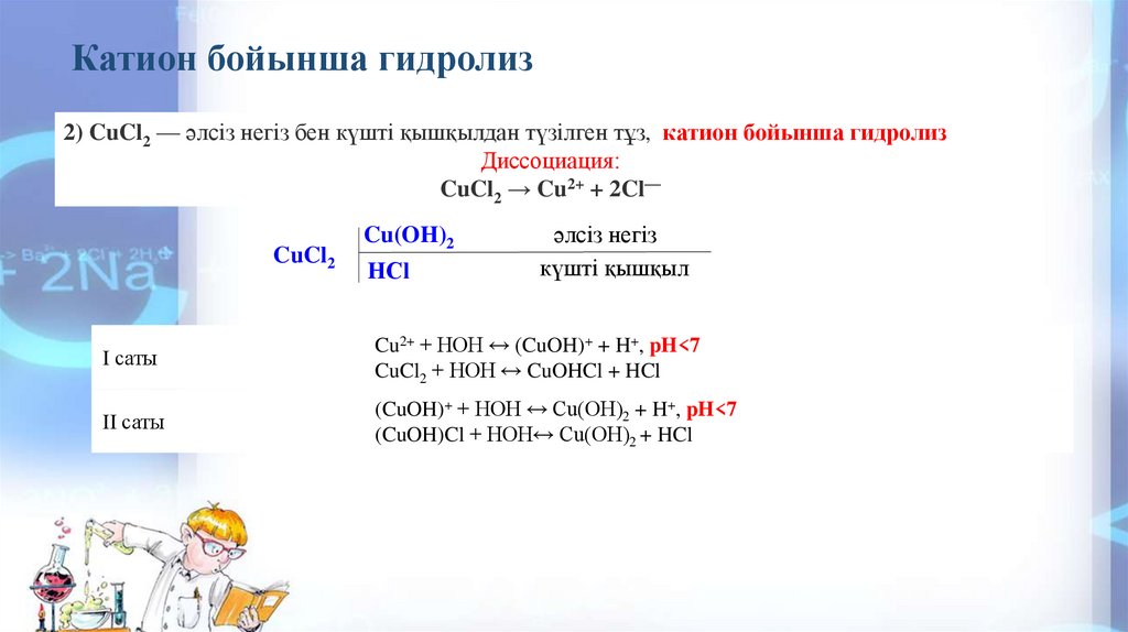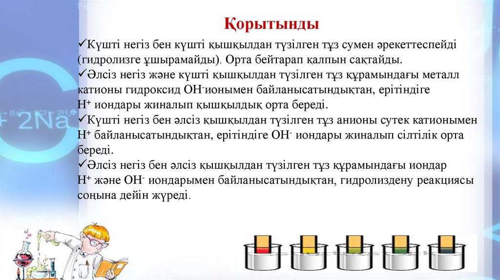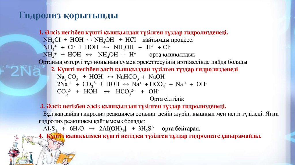Гидролиз қорытынды1. Әлсіз негізбен күшті қышқылдан түзілген тұздар гидролизденеді.