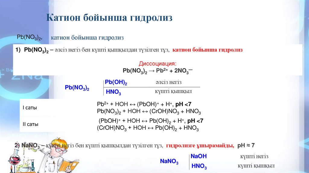 1) Pb(NO3)2 – әлсіз негіз бен күшті қышқылдан түзілген тұз, катион бойынша гидролиз