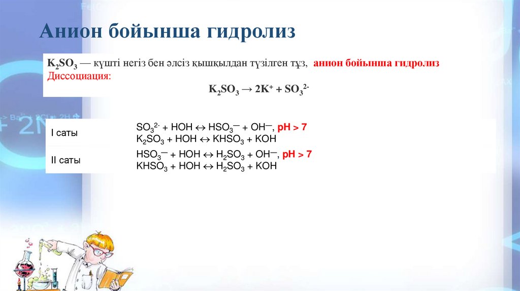 Анион бойынша гидролизK2SO3 — күшті негіз бен әлсіз қышқылдан түзілген тұз, анион бойынша гидролиз