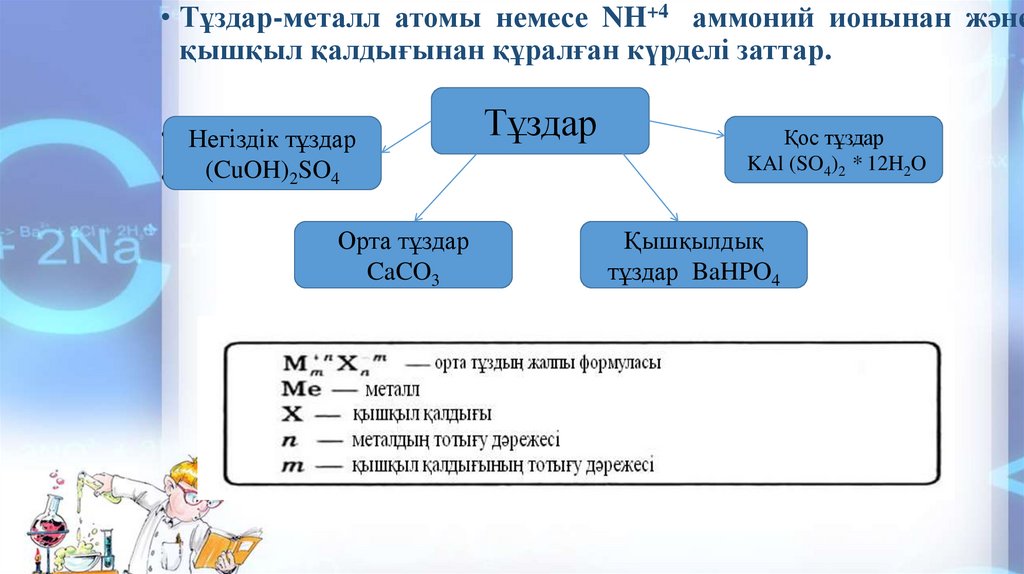 • Тұздар-металл атомы немесе NH+4 аммоний ионынан жәнеқышқыл қалдығынан құралған күрделі заттар.
