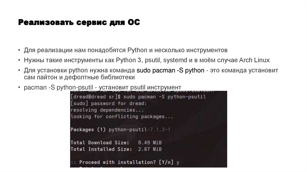 • Нужны такие инструменты как Python 3, psutil, systemd и в моём случае Arch Linux