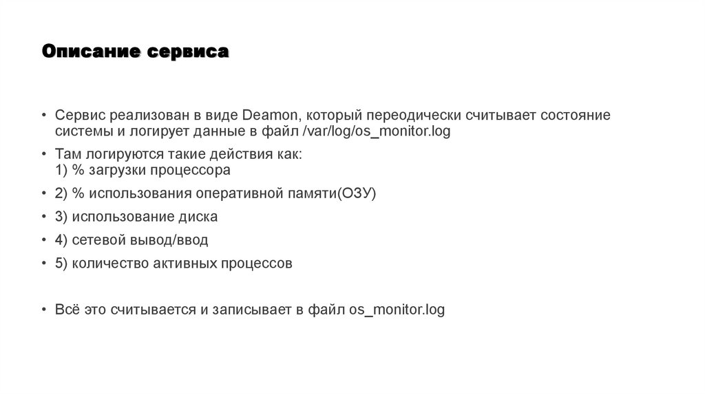 Описание сервиса• Сервис реализован в виде Deamon, который переодически считывает состояние