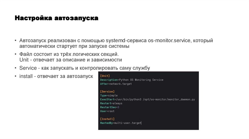 Настройка автозапуска• Автозапуск реализован с помощью systemd-сервиса os-monitor.service, который