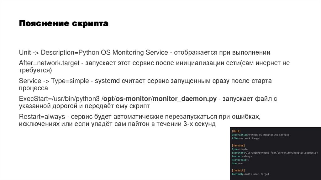 Пояснение скриптаUnit -> Description=Python OS Monitoring Service - отображается при выполнении