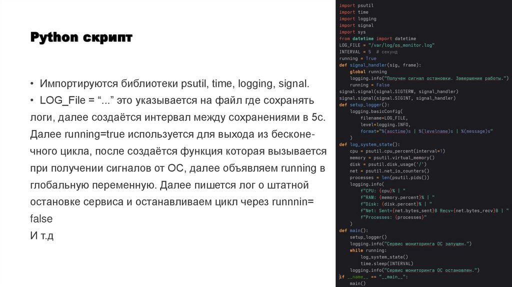 Python скрипт• Импортируются библиотеки psutil, time, logging, signal.