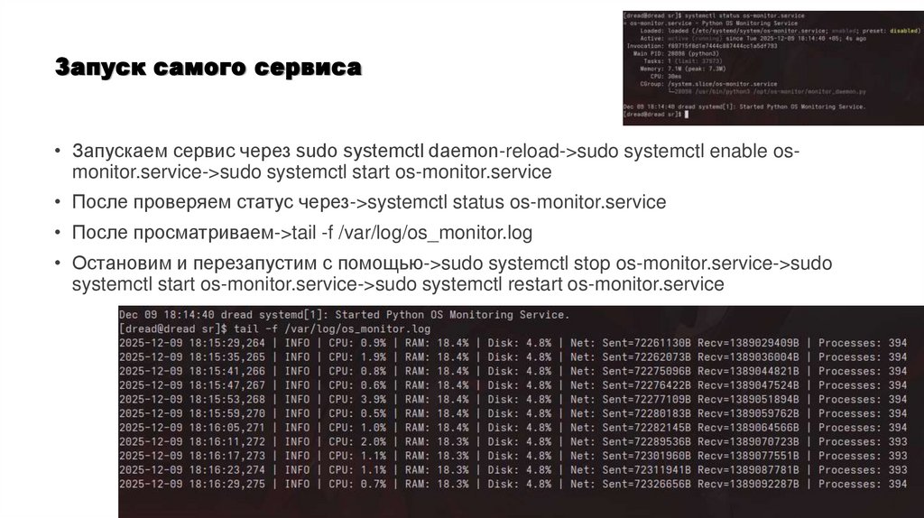 Запуск самого сервиса• Запускаем сервис через sudo systemctl daemon-reload->sudo systemctl enable osmonitor.service->sudo systemctl start os-monitor.service