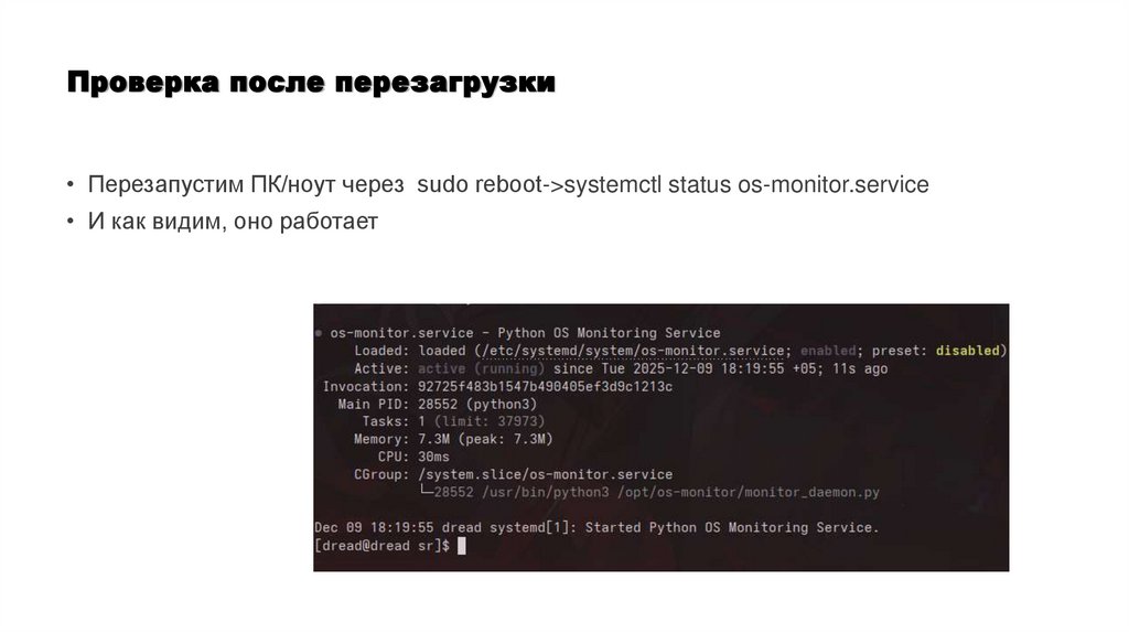Проверка после перезагрузки• Перезапустим ПК/ноут через sudo reboot->systemctl status os-monitor.service