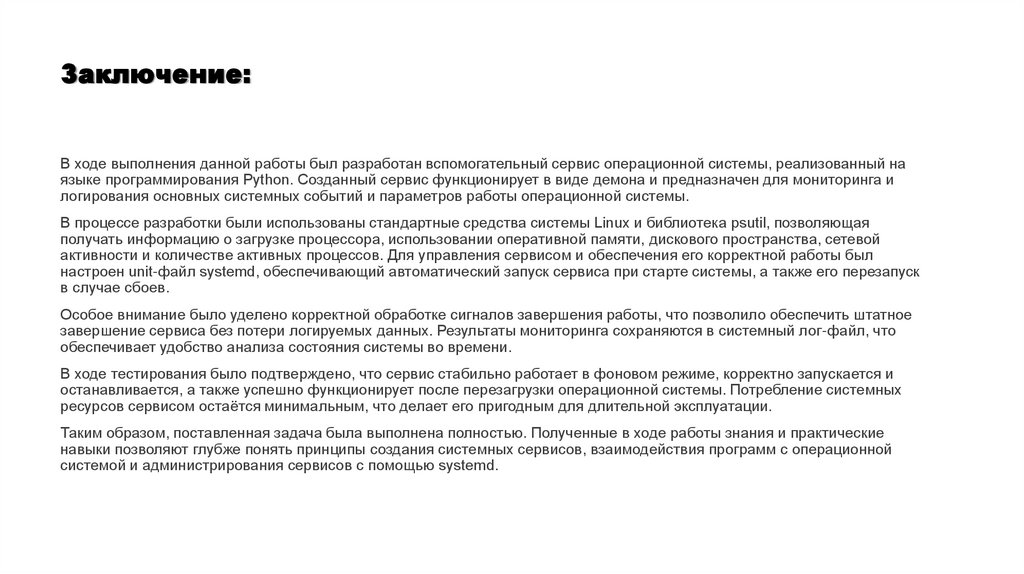 Заключение:В ходе выполнения данной работы был разработан вспомогательный сервис операционной системы, реализованный на