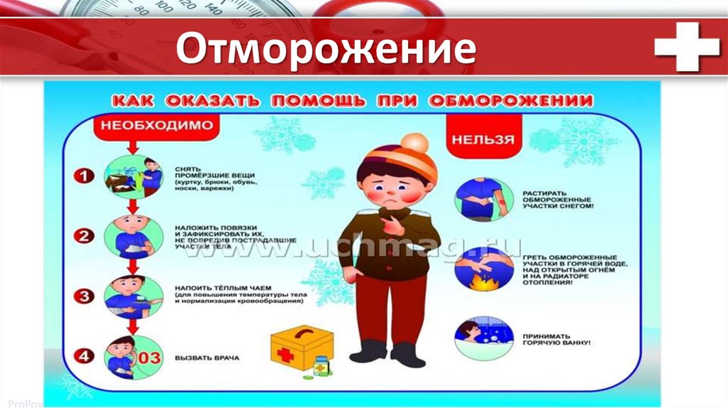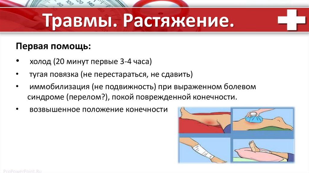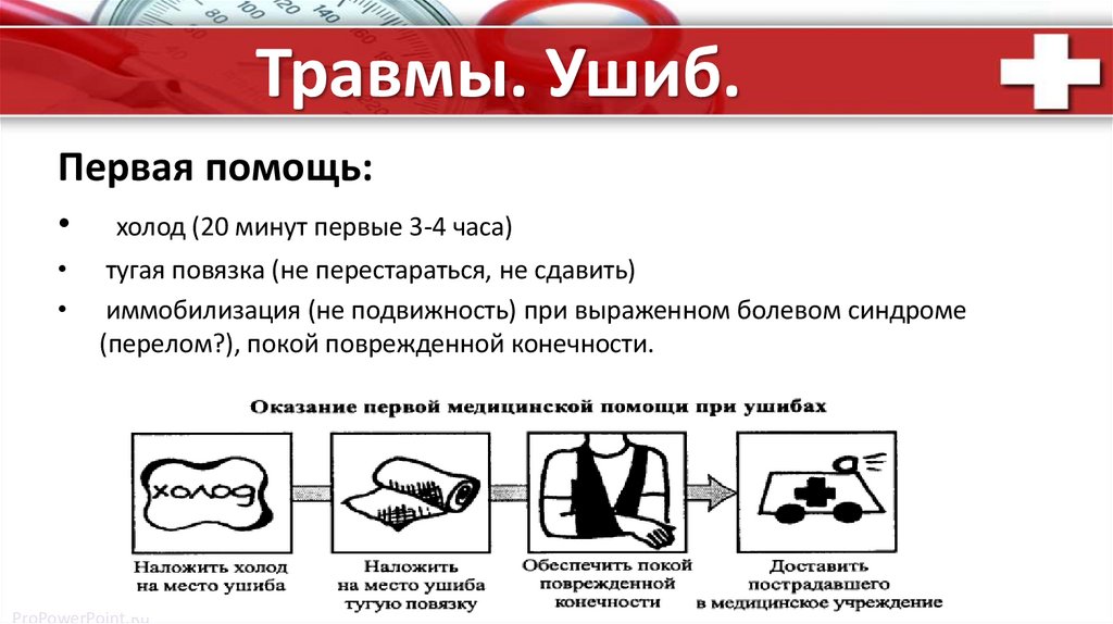Первая помощь:холод (20 минут первые 3-4 часа)